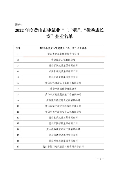 近日,黃山市住房和城鄉(xiāng)建設(shè)局發(fā)布的《2022年度黃山市建筑業(yè)二十強(qiáng)企名單》中,黃山建工集團(tuán)股份有限公司榮獲2022年“黃山市建筑業(yè)企業(yè)二十強(qiáng)”。