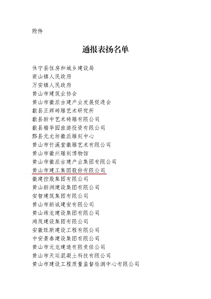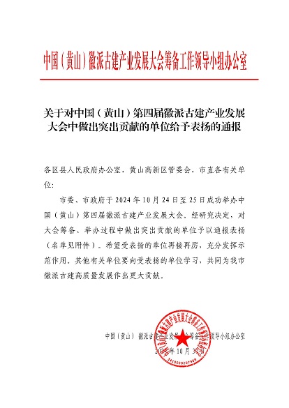 市委、市政府于2024年10月24日至25日成功舉辦中國(黃山)第四屆徽派古建產業(yè)發(fā)展大會。近日,中國(黃山)徽派古建產業(yè)發(fā)展大會籌備工作領導小組辦公室發(fā)布《關于對中國(黃山)第四屆徽派古建產業(yè)發(fā)展大會中做出突出貢獻的單位給予表揚的通報》,黃山建工集團榮列其中。